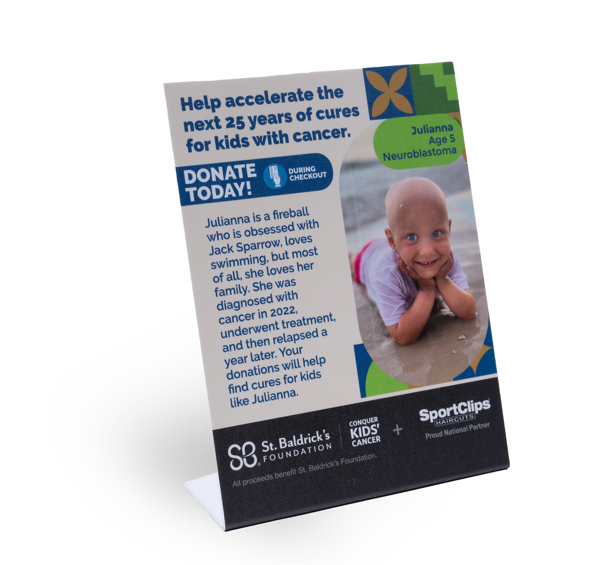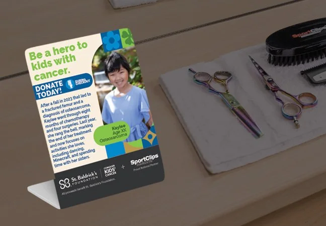 Table tents were placed throughout the store, at cutting stations and the front desk, to highlight another child’s story and encourage donations. Each design continued the visual storytelling of the campaign, using bright colors, engaging shapes, and heartfelt imagery to connect with customers and inspire them to support the cause.
