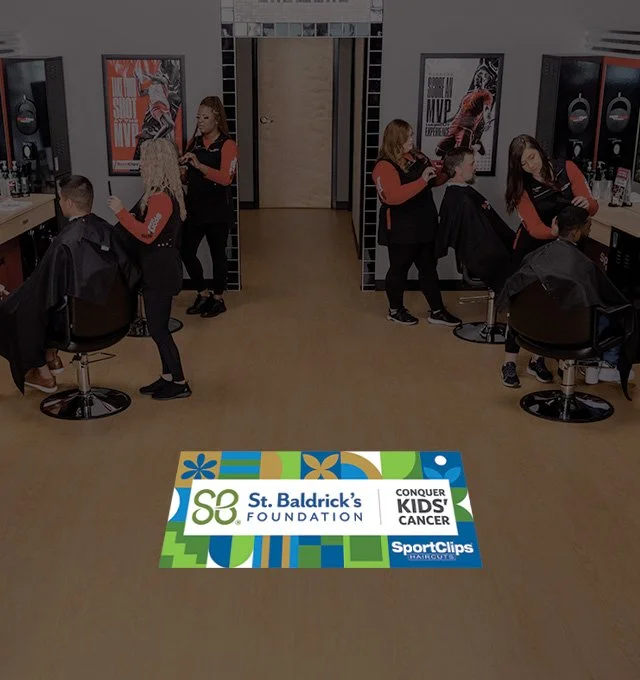 The floor decal was a large vinyl installation placed in the center of the cutting floor. While not heavy on information, it served as a bold visual element that brought significant attention to the organization. I’m proud of how the design turned out; the tile layout perfectly framed the St. Baldrick’s logo, and the playful die-cut edges added a unique touch that helped the piece stand out and draw customers’ eyes.